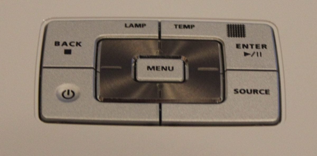 On top of the projector, toward the rear, is a control panel with basic control functions. There are buttons for Power (with indicator light), Source selection, Menu and menu navigation (Up/Down/Left/Right buttons). There are also buttons for Enter and Back that can be used for media playback (e.g., slideshow). The Enter button also serves as a play/pause button.