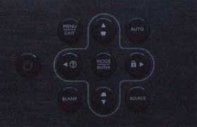 Moving to the top of the projector, in addition to the aforementioned zoom and focus rings, there is a control panel in the right rear covering the most frequently used commands, as well as some other handy functions. Included are indicators for power on, lamp status and for temperature (i.e.; overheating). There are buttons for Power, Auto Setup, blanking the screen image and selecting the source. There are also buttons to bring up and select from the on-screen menu, as well as menu navigation (Up, Down, Left, Right) buttons. The Left and Right menu navigation buttons also function to bring up the FAQ page and to lock the Panel buttons respectively. The Up and Down menu buttons also function to adjust keystone correction up and down as well. Finally, the Menu Select button also functions to select the Picture mode.