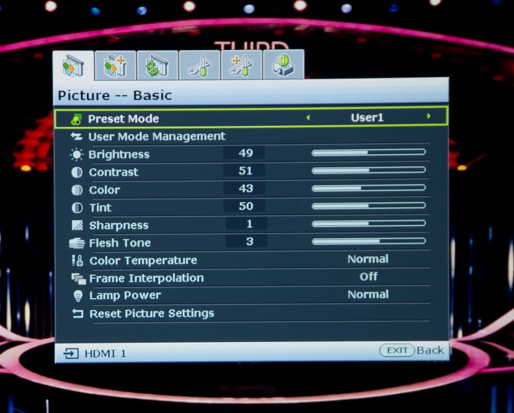 This slide show has all the major menus, and most minor ones, so the captions will provide almost all of the commentary. BenQ isn't that big on lots of pull-down sub-menus, so that, for example Preset modes - you can only see the one selected, and toggle through the others by using the left and right arrow keys on the remote or the control panel. With a number of other brands, you might select enter, and get a pull-down menu where you can see all the modes at once. Either way, not a big deal. It does mean though, that we needed to take less pictures.