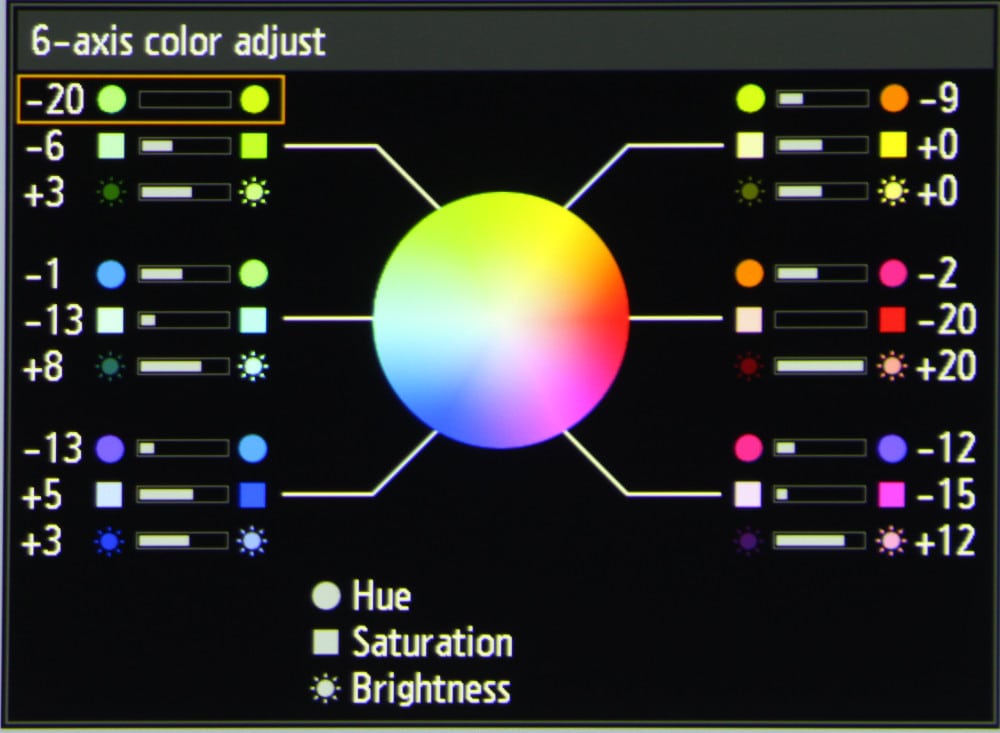 There is also a second level menu called Advanced that is shown in the 4th gallery photo. This allow the user to set several items such as use of noise reduction processing. Perhaps the most interesting item on the Advanced menu is the item for "6-axis color adjust." This item provides access to the projector's color management system (CMS). When this is selected the third-level menu shown in in the 5th gallery photo is displayed. This provides the essential tools for a professional calibration of the projector.