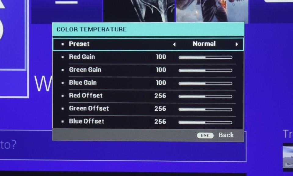 The Picture Menu, of course, is where you can access the Picture Modes. There’s Bright, Natural, and Vivid – none of which are very good, but more on that later. What saves this projector’s Color Modes are the two User Modes where you can adjust the color to your liking. I’ll provide settings on the Picture Quality Page that I feel improve the color.
