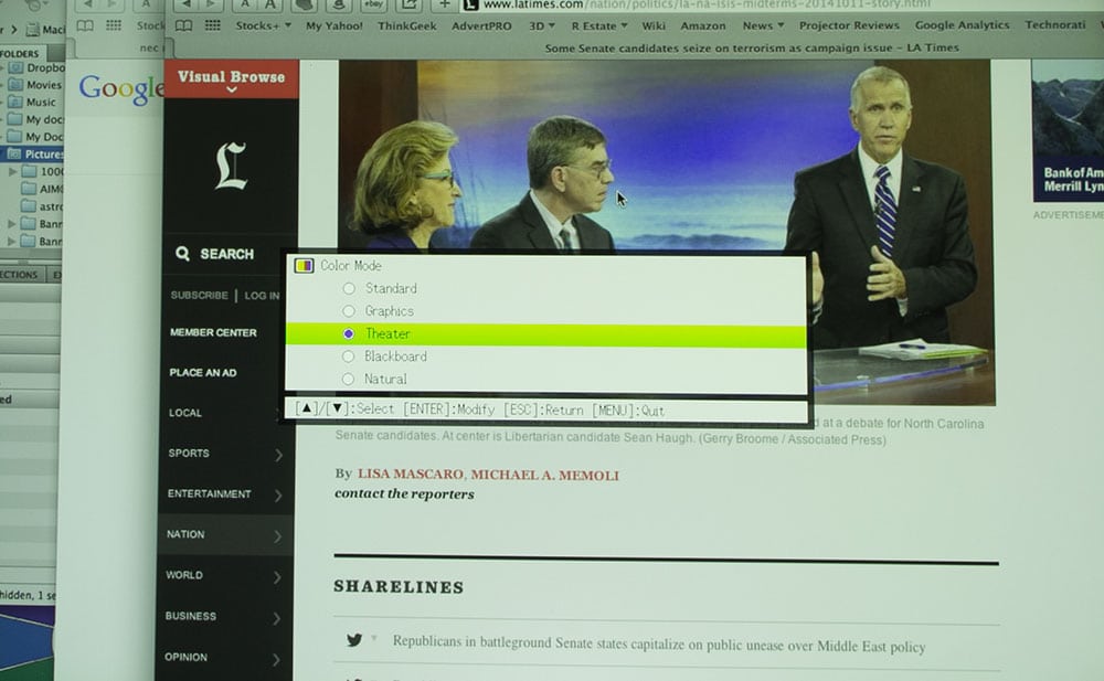 The last picture in the LA Times sequence is an "optimized image" of Theater mode" It is the same original Theater image, but I've taken the liberty to Photoshop it, so that it looks much closer to the same image being projected. In other words the last image is a far better representation of Theater mode. I did my photoshopping on my computer while projecting the image so that I could compare! My Photoshopped version is a far more accurate representation of this projector's abilities! Obviously, all the other modes are affected similarly.