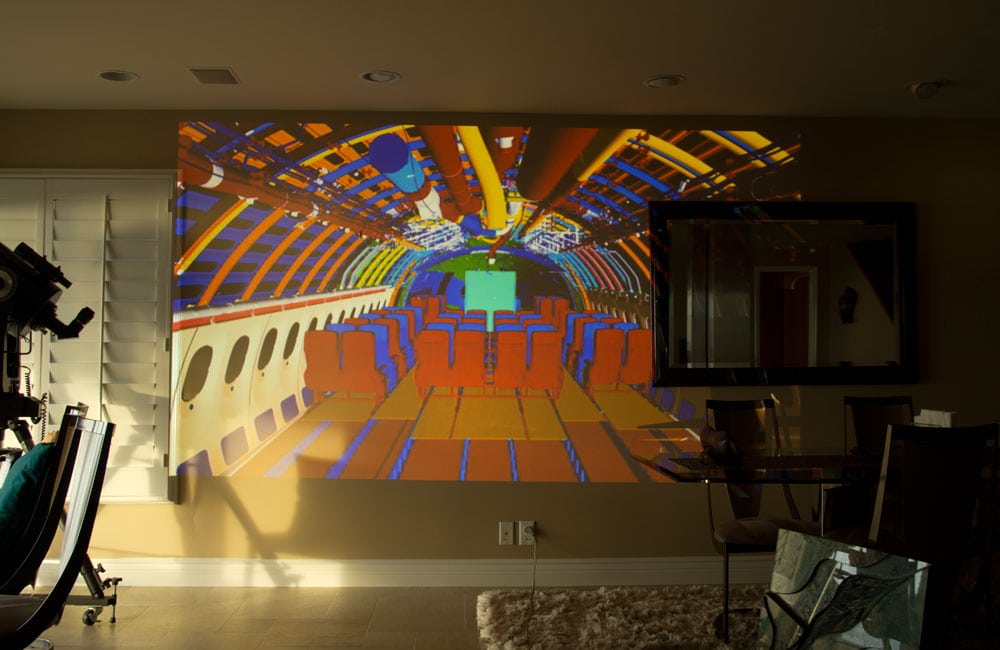 It should be noted, in the image above, that the image size is about 6 feet vertically, and since it's a 16:9 image, we're looking at about a 12 foot diagonal image! That's very nicely huge! BTW that dark area on the right is a mirror, it was just too heavy to remove when taking pictures.