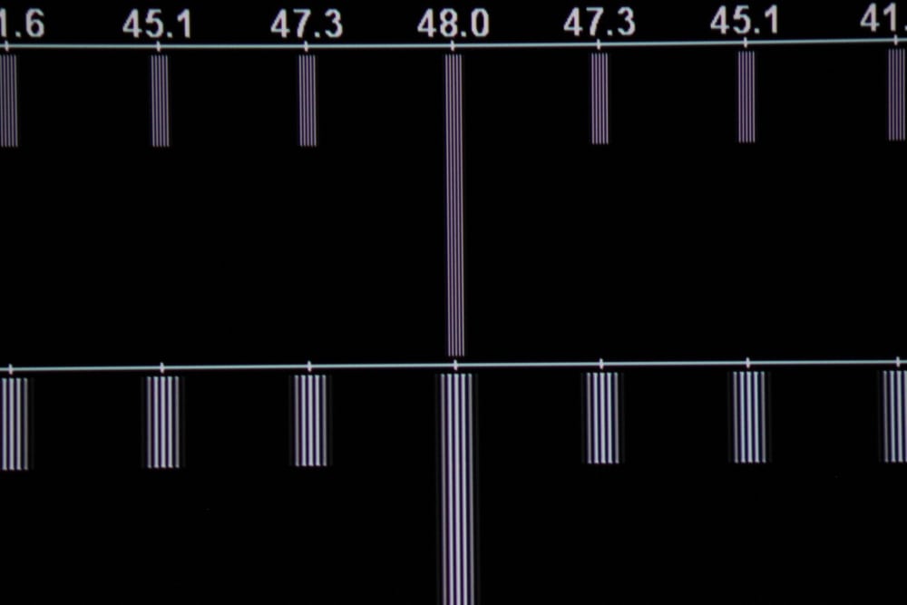 For each resolution there are stationary sets of vertical lines extending downward from a horizontal line and just below that is the moving burst pattern with its own set of lines essentially identical to each of the stationary sets. In the 1st and 3rd photos about the moving burst pattern is not lined up with any of the stationary sets while in in the 2nd photo I happened to catch the moving burst pattern as it was lined up with one of the stationary sets.