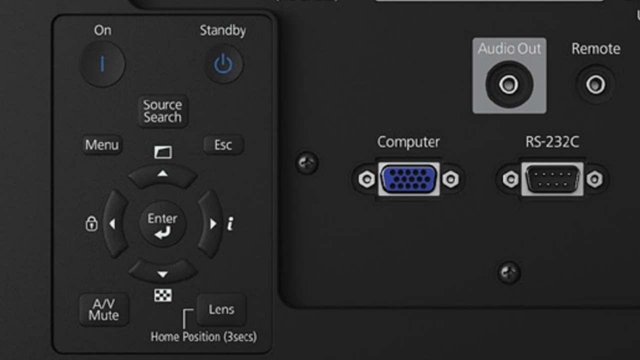 The Epson EB-PU1008W control panel is located on the back of the projector to the left of the inputs. The Power switch is on the top left of the control panel – press once to power up. The Off switch (Standby) is to its right ― press twice to power down. Below those buttons is the Source Search button. Further down to the left is the Menu button with the Esc (Escape) button on the right side of the panel. Escape backs up one level in the menus when pressed. One row down is the Navigation Control buttons, including four arrows in a round layout formation with the Enter button in the middle of the arrow keys.