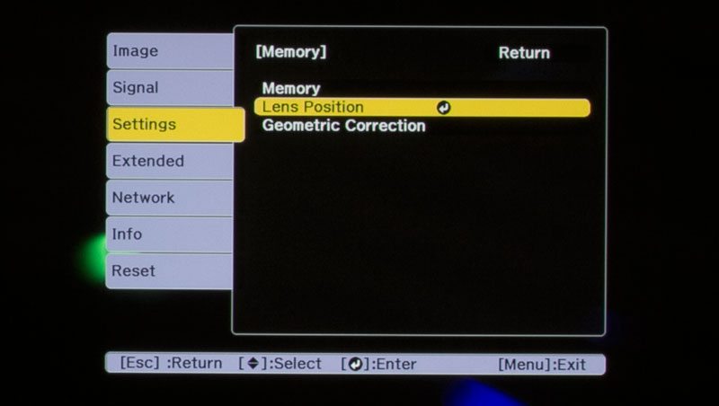The second section, in addition to usual things like Color Mode or Aspect Ratio, also serves up three buttons for the lens (Zoom, Focus, Lens Shift) and also Split Screen, and Test Patterns.