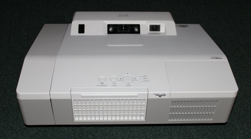 As is typical for ultra short throw projectors, the projection lens of the CP-TW2503 is positioned toward the rear on the top surface (with the projector sitting on a table). The lens it is tilted at a steep angle, pointing “up” when the projector is table mounted just below the projection surface, or “down” when wall mounted just above the projection surface, with the light from the projector emerging at a steep angle. The lens is recessed within a rectangular opening as shown in the following photo.