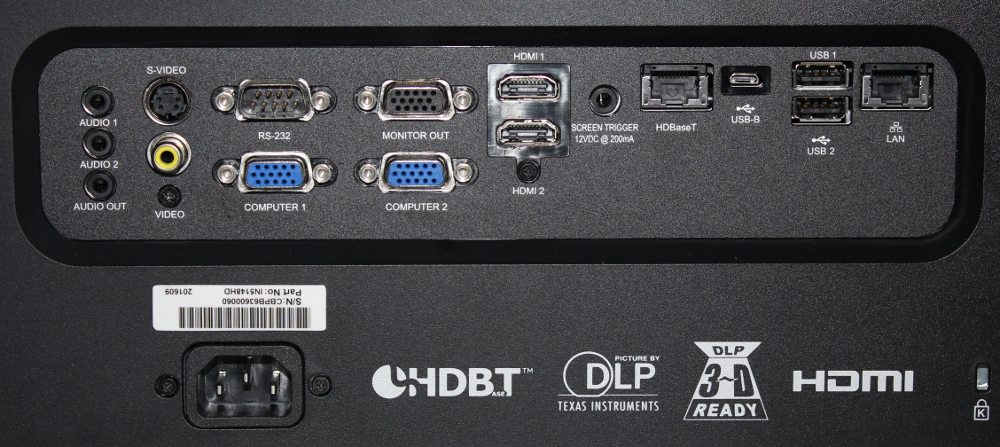 The connector panel, as pictured above, is located on the rear of the projector. Toward the left are two analog audio inputs and one analog audio output. Next (going from left-to-right) are S-Video and composite (analog) video input connectors. Next is a RS232 serial comm. connector and below that the Computer 1 analog video input (VGA style) connector. To the right of those are the analog monitor output and below that the Computer 2 analog video input. Next are HDMI-1 and HDMI-2 digital A/V inputs. Next is a 12 volt trigger connector than can be used for automatically controlling a compatible electric drop-down screen and to the right of that is the HDBaseT connector. Next are one mini-USB and two full size USB connectors and to the right of those is the LAN (Ethernet) connector. Finally, the 120 volt power cord attaches to a connector toward the bottom of the connector panel.