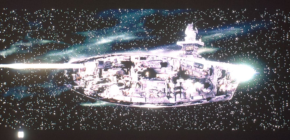 First is a seriously overexposed shot of the starship in The Fifth Element. Note, that even with this ridiculous level of overexposure, the blacks in the image and the letterbox are still not dramatically brighter than black, if you compare it to the image right below. Immediately below it, is a less overexposed version, which is also better for comparing with the same image in older reviews.