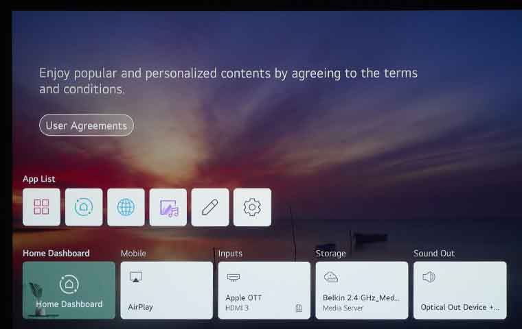 The Home button, which looks like a house, allows you to access apps and other entertainment services. Once you are in the projector app menu, you can select a specific input, a streaming app, the web browser, a media player, or explore LG's Content Store.