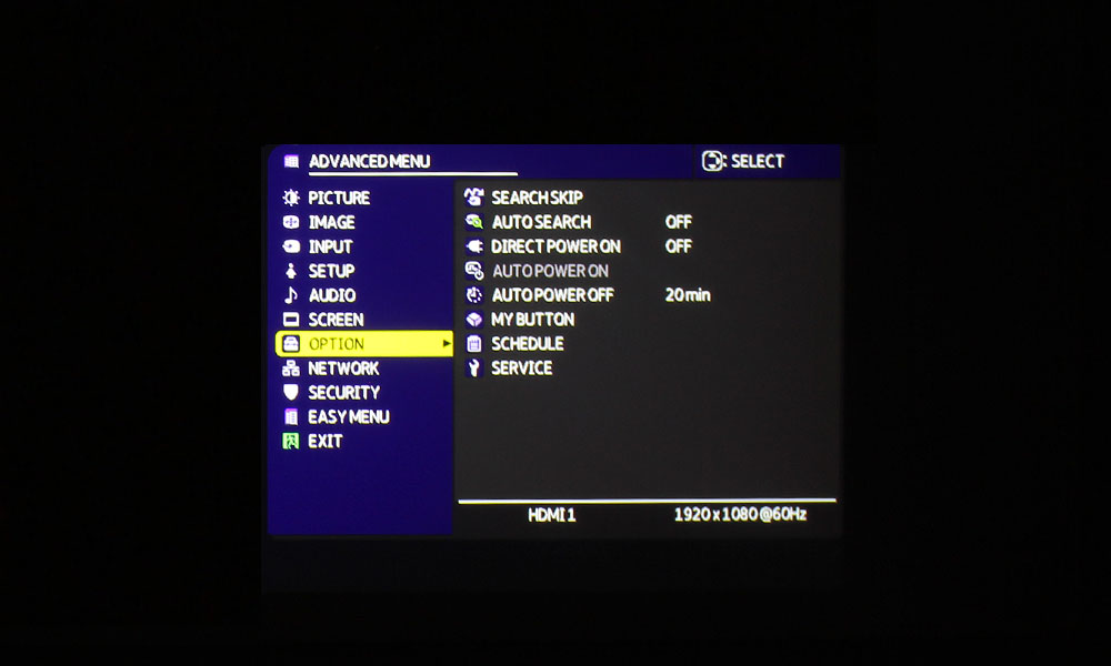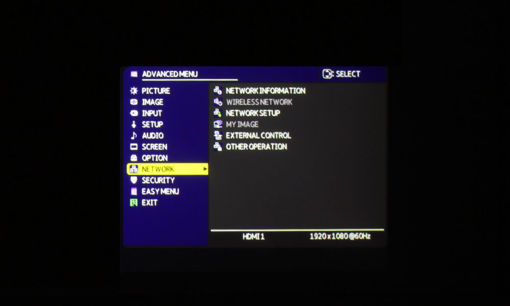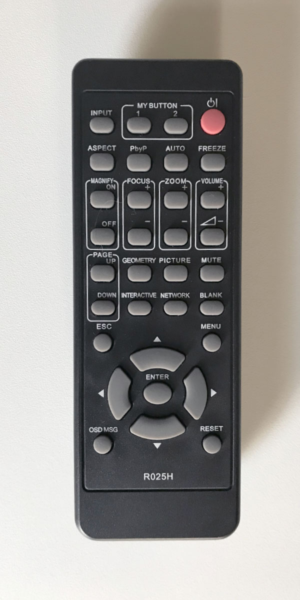 The section below has one set of stacked buttons for Page Up and Page Down. Next to Page Up, and moving toward the right, we have Geometry, Picture (brings up the Picture Mode Menu), and Mute. Next to the Page Down button, moving toward the right, there’s an Interactive button (this projector is NOT interactive), the Network button (opens the Network Menu), and the Blank button.