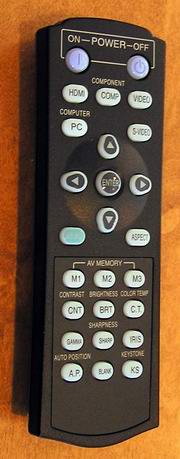 The Mitsubishi HC1500's remote control is a small black unit, with backlit buttons.