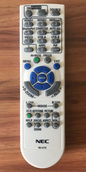 The remote control for the NEC NP-MC382W is light-weight and fits comfortably into the hand. It’s not backlit – I always put this in the Cons sections of my reviews, if the remote isn’t backlit – which would have been nice. Art’s been hounding projector manufacturers for decades to include this in their remotes. That the remote control is light colored with darker buttons helps, but I still would prefer that all remotes in existence have a backlight feature.