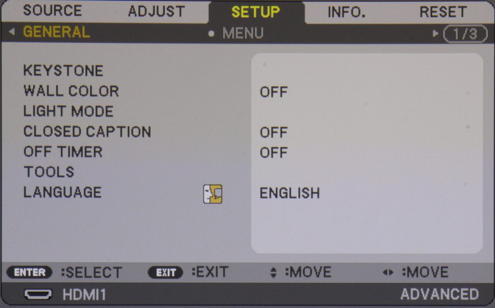 Across the top of the Setup menu are listed the available categories of setup related sub-menus (i.e., General, Menu, and pages 2 and 3 of the setup menu). The top-level Setup>>>General menu is shown in the 1st gallery photo above. Under ‘General’ are settings for such things as keystone correction and the menu language. The 2nd photo shows the sub-menu for Light mode where normal or two different lower power Eco modes can be selected. The 3rd photo shows the "Tools" sub-menu.