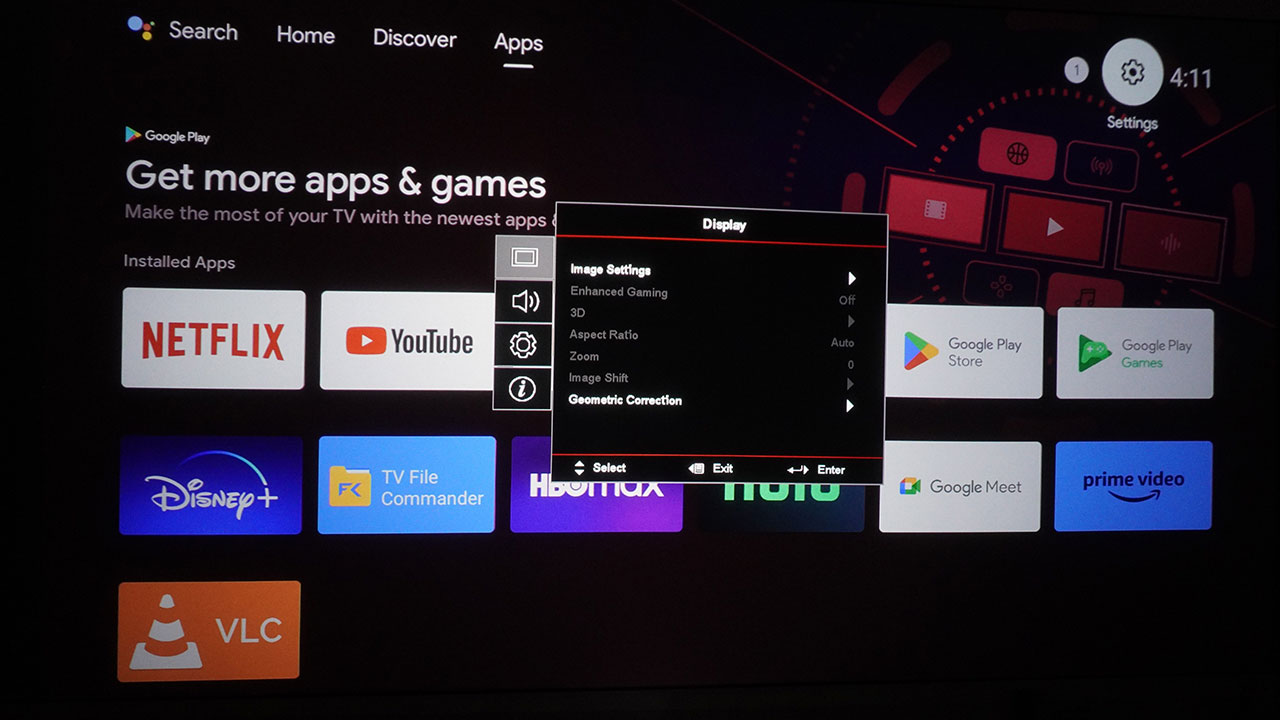 The Optoma projector menus are straightforward, with four separate menus covering DISPLAY, AUDIO, and SETUP features. This menu system is entirely separate from the Android TV menus for the external smart device.