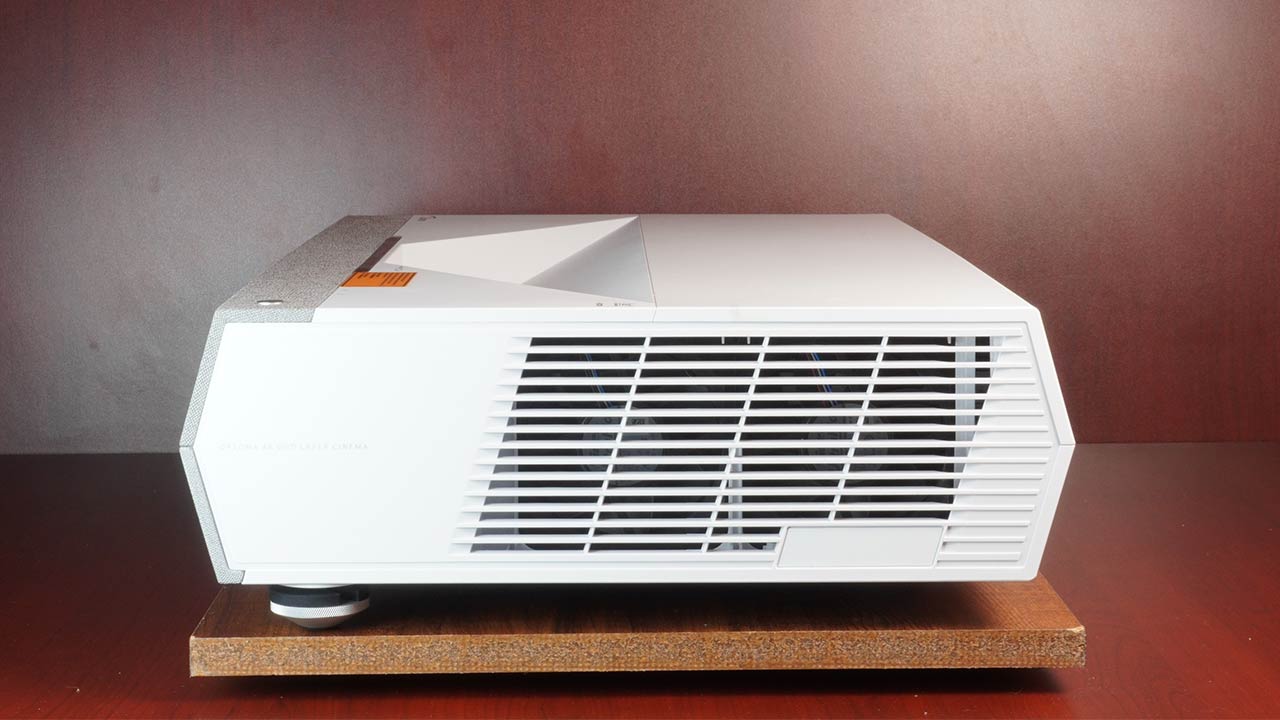 Optoma has removed the side USB and HDMI connections and moved all inputs and outputs to the back, with ventilation located on the projector's left, right, and rear.