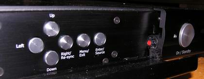 From the front: Only the large power button toward the far right (and the IR sensor) is visible, with the front hinged door closed. Open it up, and you will find a basic control panel, near the center. It offers (from the right) the usual, Source button, which doubles as the Enter button when menus are in use. Next to the left is the Menu button. Further left are four silver buttons in the usual diamond layout, for left/right/up/down functionality when navigating the menus.