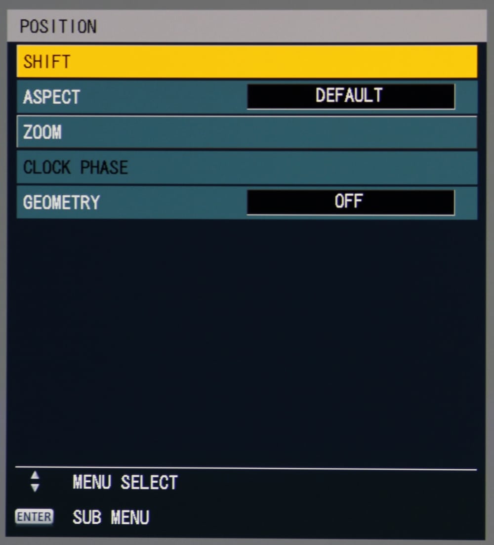 The Position submenu allow for adjustments to be selected for lens shift, aspect ratio and lens zoom. The Clock Phase setting is only applicable with analog signal inputs and the Geometry item allows the user to access settings to correct for various types of geometric distortions of the projected image, including a preset when using a curved screen. Also a submenu can be access to adjust the corners of the image for geometric corrections. A connected PC can also selected to control the geometric corrections.