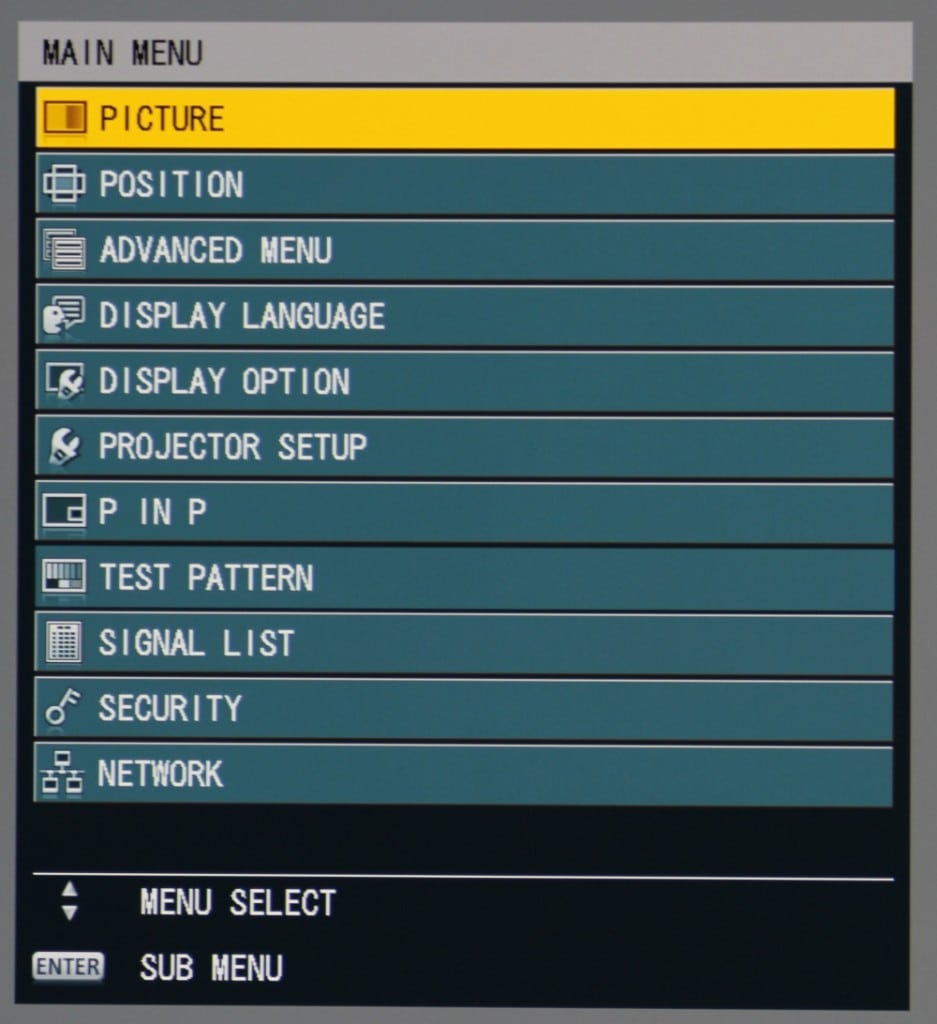 The Projector Setup is another important item that is accessed from the Main Menu. The first page of the Setup Menu is shown below.