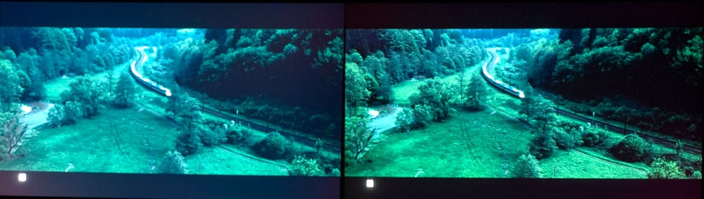 Above, good contrast projector on the left (Epson 8350), and ultra-high contrast projector on the right - Epson Home Cinema 8700UB. The image is intentionally overexposed so you can see the dark shadow detail, and also the additional dynamic look, thanks to superior black level performance of the 8700UB.