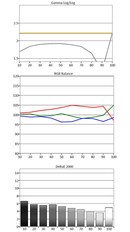 Delta E, as a measure of grayscale/color accuracy, of 3 and under is considered ‘Excellent’ and imperceptible by the human eye. Even before calibration, the average grayscale dE for the THEATER mode was around 5 which is good.