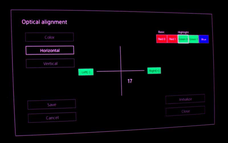 This Sony allows you to easily align the red green and blue colors, with a tool you select from the menu. It lets you choose each primary color, then adjust the vertical and horizontal "white" lines, so that the colors are in alignment. That means, for example, if red is slightly to the right of green and blue, you can adjust it so that it aligns perfectly, creating white. The gallery here shows all the menu steps to perform the alignment. We did not repeat for each color.