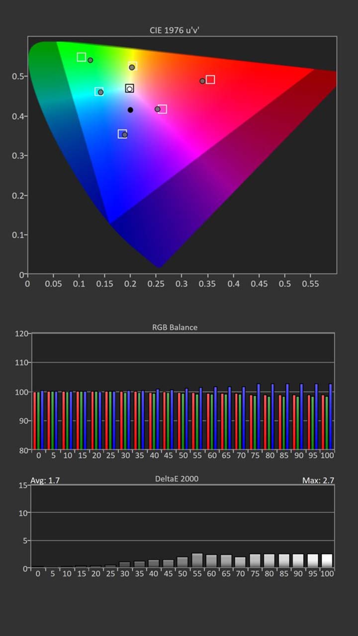 The color temperature was already very close to our 6500K. We switched the COLOR TEMP from its default of D65 to the nearly identical-looking CUSTOM 3 setting so we could compare the grayscale before and after adjustment.