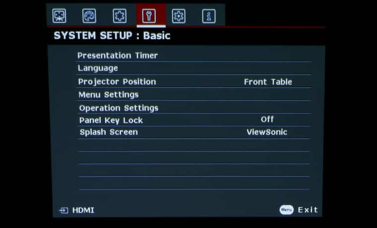 System Setup: Basic Menu – Presentation Timer, Language, Projection Position, Menu Settings, Operation Settings, Panel Key Lock, Splash Screen