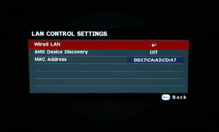 LAN Control Settings Sub-Menu – Wired LAN, AMX Device Discovery, MAC Address
