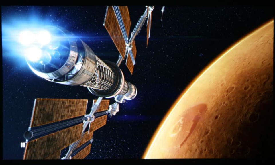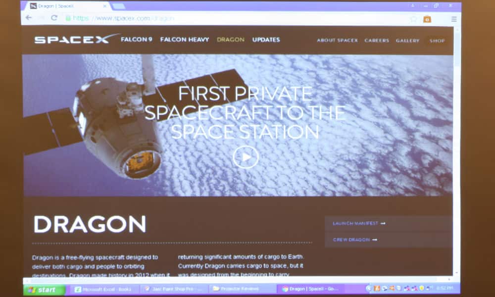 To illustrate how this projector cuts through ambient light, the image below was taken at night with the curtains drawn, shades closed and lights off, followed by one with the overhead lights on – including two lights directly above the screen. These two photos, like all the others showing video and presentation content, we taken in Standard Mode.