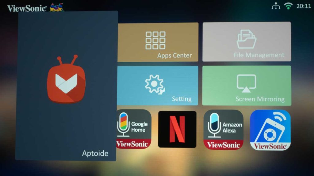 The Home menu appears when you turn on the X100-4K. The menu has a large rectangular tab for the previously mentioned Aptoide app. At any time, you could press the Home button, which looks like a house, to brings you to the home screen.