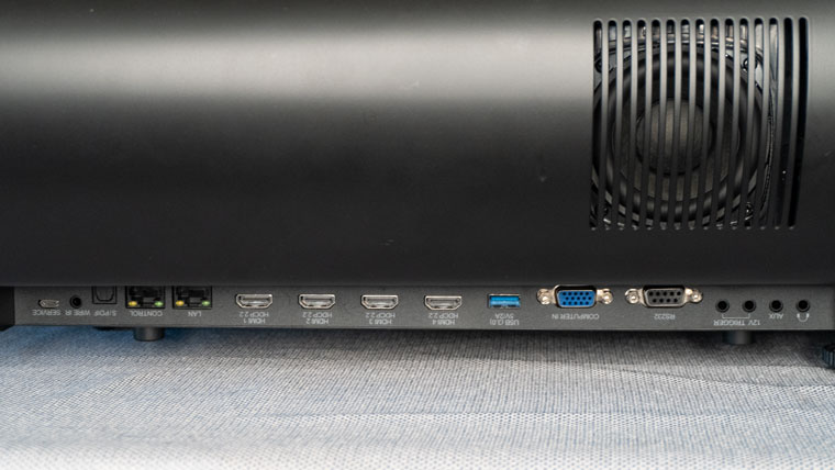 The X100-4K has plenty of inputs and connectors. The projector has an audio signal output socket (3.5mm jack), audio signal input socket (3.5mm jack), 12V DC output terminal (12V trigger), RS-232 control port, VGA signal input port, USB 3.0 Type-A port (USB Reader - FAT32), HDMI ports, RJ45 LAN port, a control port for compatible home automation systems, S/PDIF signal output socket, connection port for IR sensor extender, and a service port for Firmware updates.