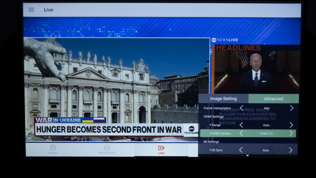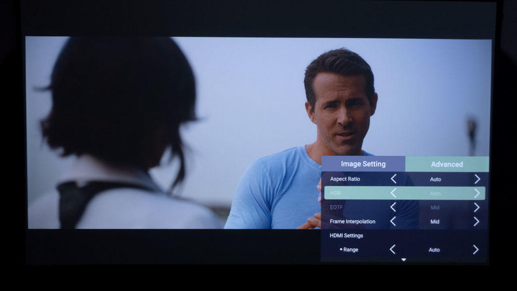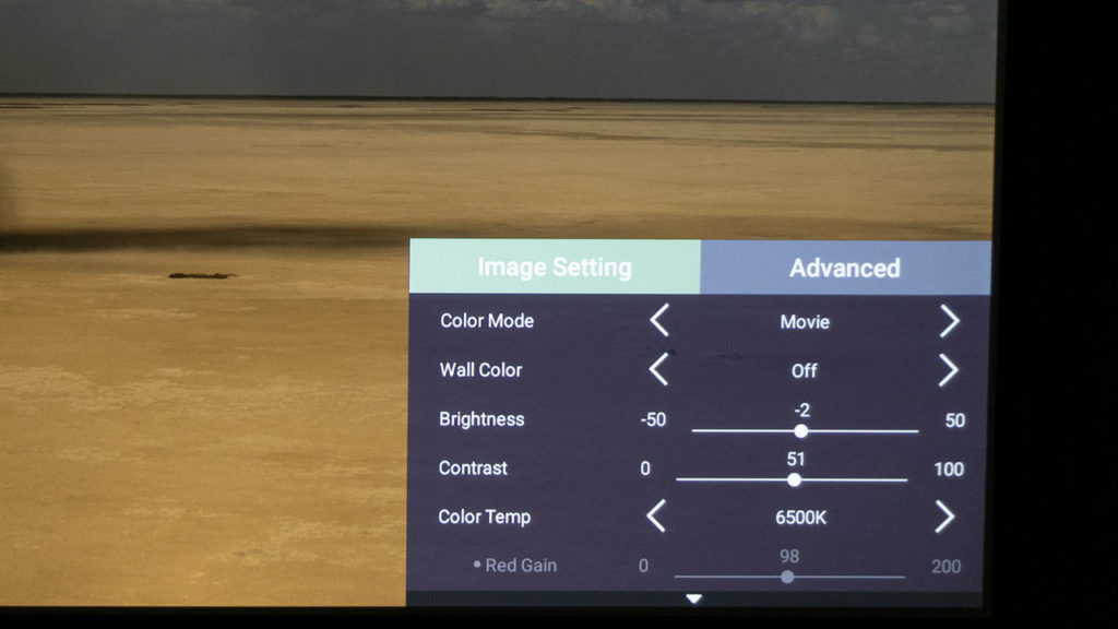 Pressing the icon that looks like a gear on the remote control will bring up the On-Screen Display (OSD) menu. The OSD has two tabs, one that says Image Setting and the other that says Advanced. Image Setting gives access to Color Mode, Wall Color, Brightness, Contrast, Color Temp, Tint, Saturation, Sharpness, Gamma, Color Management, Light Source Level, Test Pattern, and Reset Current Color Settings.