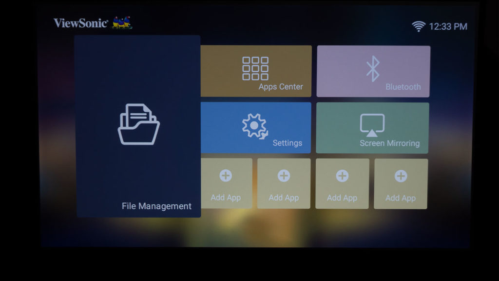 The X2000B-4 K’s Home button brings you directly to the projector’s Home screen. You can access the File Management, Apps Center, Bluetooth, Settings, Screen Mirroring, and Add App menus from the Home screen.