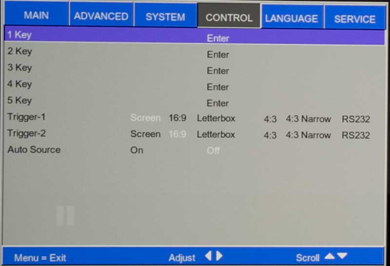 Right below are 5 buttons, cleverly labeled 1 through 5. These are your Source control buttons. Instead of pre-assigning them HDMI 1, 2, etc. Vivitek lets you go into the menu system and select which source to assign to each button. I stuck with the defaults which made button #1 (Vivitek calls it Key 1) HDMI 1, #2, HDMI 2, #3 Component Video 1, and so on.
