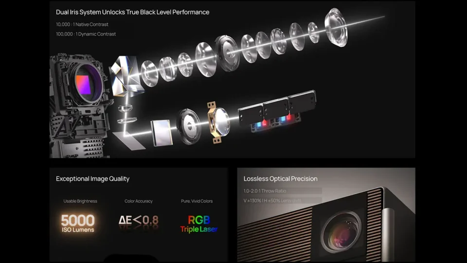 The inclusion of a dynamic iris is notable because most single-chip DLP laser projectors, including many in XGIMI’s lineup, use fixed-aperture designs that deliver strong brightness but comparatively limited contrast. The Titan Noir Max’s iris system adjusts the effective aperture in real time based on scene content, reducing light output in darker scenes to deepen black levels and widening it in brighter scenes to preserve peak brightness.